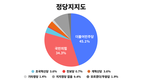 더불어민주당 45.1%, 국민의힘 34.3%, 조국혁신당 3.6%, 개혁신당 3.6%, 진보당 0.7%, 기타 정당 1,4%, 지지정당 없음 9.4%, 잘 모르겠다/무응답 1.9%