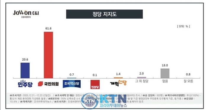 국민의힘 66.5%, 더불어민주당 17.2%, 개혁신당 1.6%, 조국혁신당 1.5%, 진보당 1.4%, 기타 및 지지정당 없음 11.1%, ‘잘 모르겠다’ 1.7%