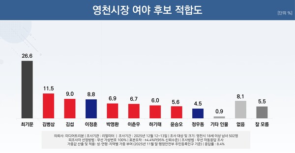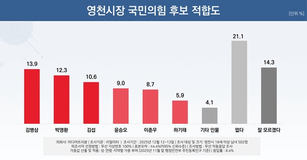 * 이번 조사는 코리아투데이뉴스 의뢰로 조원씨앤아이가 2025년 12월 21~22일 이틀간 영천시 거주 만 18세 이상 남녀를 대상으로 무선 자동응답(ARS) 여론조사(휴대전화 가상번호 100%, 성, 연령대, 지역별 비례할당 무작위 추출)를 실시한 결과이며 표본수는 503명, 표본오차 95% 신뢰수준에 ±4.4%포인트, 응답률은 10.6%임. 그 밖의 사항은 중앙선거여론조사심의위원회 홈페이지 참조