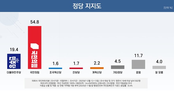 국민의힘 54.8%, 더불어민주당 19.4%, 개혁신당 2.2%, 진보당 1.7%, 기타 정당 4.5%, 무당층 15.7%(없음 11.7% + 잘 모름 4.0%)
