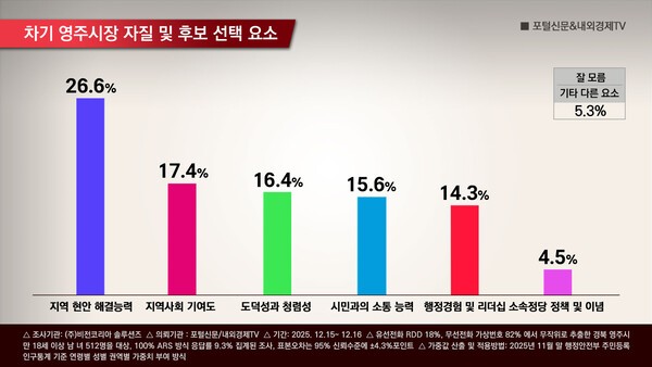 지역 현안 해결 능력 26.6%, 지역사회 기여도 17.4%, 도덕성과 청렴성 16.4%, 시민과의 소통 능력 15.6%, 행정 경험 및 리더십 14.3%, 소속정당 정책 및 이념 4.5%