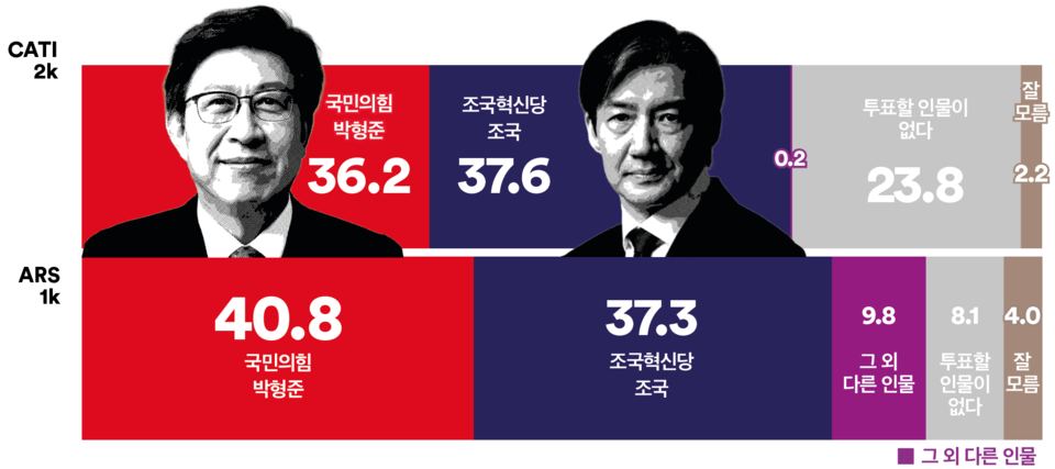 - 연령별로 살펴보면 ARS 자동응답조사의 경우 40대와 50대에선 조국 대표가 우세했고 18세 이상 20대와 60대, 70대 이상 노년층에선 박형준 시장이 우세했다. 30대는 접전이었다. 전화면접조사에서도 40대와 50대에서 조국 대표가 우세했고 30대에서도 근소하게 우세했다. 반면 18세 이상 20대와 70대 이상 노년층에선 박형준 시장이 우세했고 60대에서도 근소하게 우세했다.