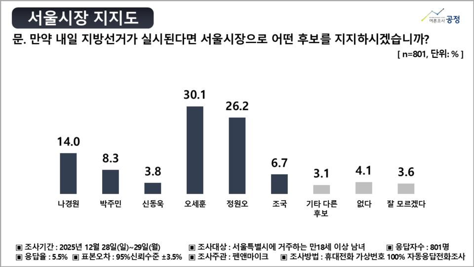 펜앤마이크 의뢰, 여론조사공정 12월 28일-29일 서울에 거주하는 만 18세 이상 남녀 801명 대상 조사