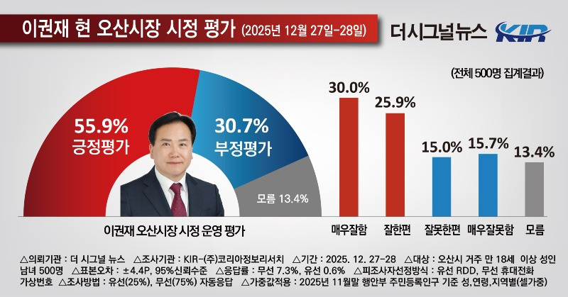 * 이번 조사는 <더 시그널 뉴스>가 코리아정보리서치에 의뢰해 2025년 12월 27일부터 28일까지 이틀동안 오산시 500명을 대상으로 전화조사로 진행했다. 보다 자세한 사항은 중앙선거여론조사심의위원회 홈페이지를 참조하면 된다.