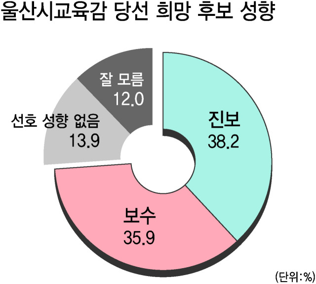 진보 후보 38.2%, 보수 후보 35.9%, 선호 성향이 없다 13.9%, 잘 모르겠다 12.0%