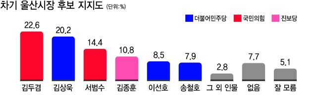 김두겸 시장 22.6%, 민주당 김상욱 의원 20.2%, 이선호 청와대 자치발전비서관 8.5% , 민주당 송철호 전 울산시장 7.9%