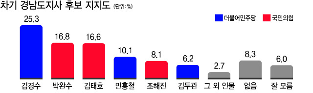 김경수 위원장 25.3%, 박완수 16.8%, 김태호 의원 16.6%, 민홍철 10.1%, 조해진 8.1%, 김두관 6.2%, 그 외 인물 2.7%, 없음 8.3%, 잘모름 6.0%