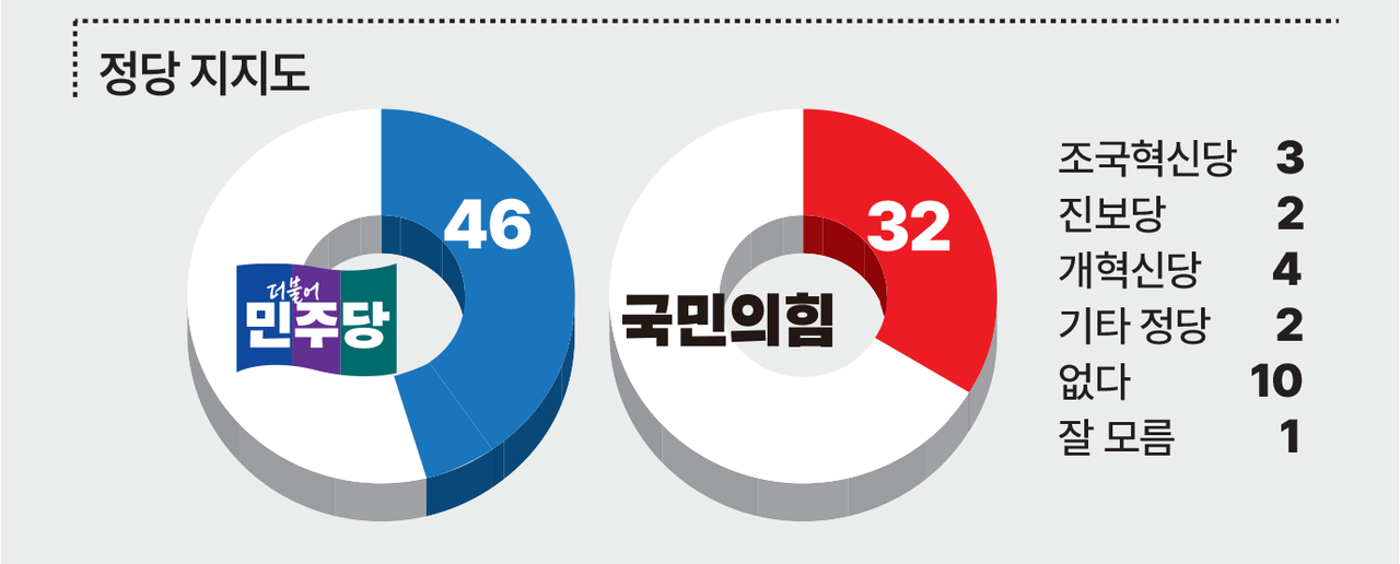 민주당 45.6%, 국민의힘 32.4%, 개혁신당 4.1%, 조국혁신당 3.0%, 진보당 1.5%, 없다 10.1%, 기타정당 1.9%, 잘 모르겠다 1.4%