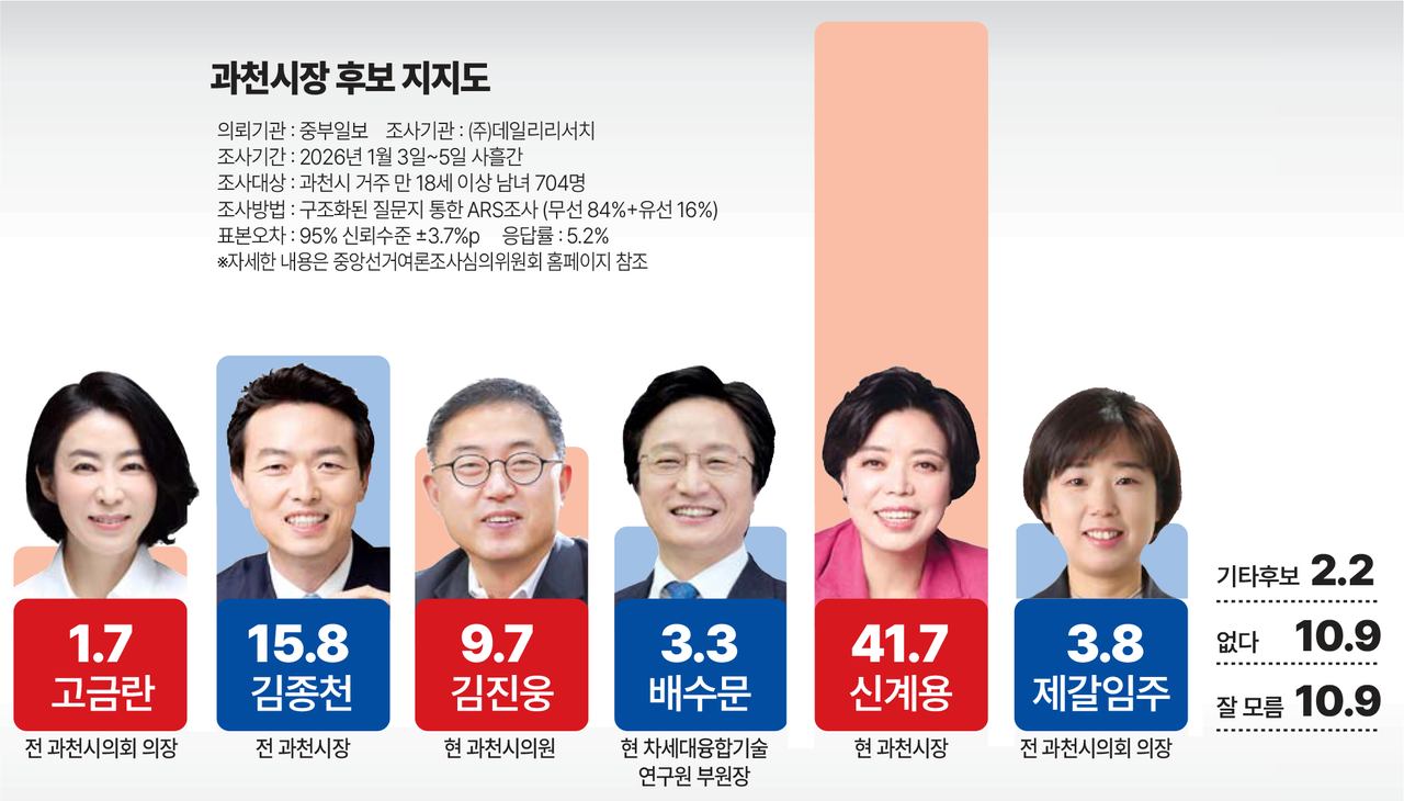 * 중부일보가 여론조사기관 데일리리서치에 의뢰해 실시한 이번 여론조사는 1월 3일부터 5일까지 사흘간 과천시에 거주하는 만 18세 이상 남녀 704명을 대상으로 구조화된 설문지를 이용해 유선 RDD와 통신사가 제공한 무선 가상번호 ARS 여론조사 방식(무작위추출)으로 진행됐다. 유·무선 비율은 유선 16%, 무선 84%다. 통계보정은 2025년 11월 말 행정안전부 주민등록 인구통계 기준 성별·연령별·지역별 가중값(셀가중)을 부여했다. 응답률은 5.2%, 표본오차는 95% 신뢰수준에 ±3.7%다. 기타 자세한 내용은 중앙선거여론조사심의위원회 홈페이지를 참고하면 된다.