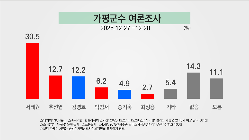 * 이 조사는 NGN뉴스가 한길리서치에 의뢰하여 2025년 12월 27일부터 12월 28일까지 이틀간 가평군민 501명을 대상으로 자동응답조사로 진행됐다. 보다 자세한 사항은 중앙선거여론조사심의위원회 홈페이지를 참조하면 된다.
