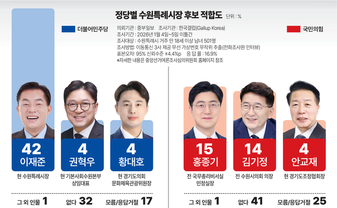 중부일보 의뢰, 한국갤럽 1월 4~5일 수원시에 거주하는 만 18세 이상 501명 대상 조사