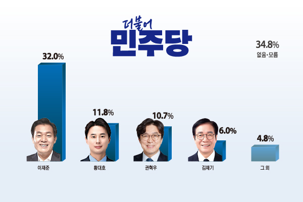 - 지지 정당별로 보면 민주당 지지층에서 이 시장은 47.0%로 가장 많은 지지를 받았다. 황 대변인 15.5%, 권 부위원장 12.9%, 김 대표 3.7%다.