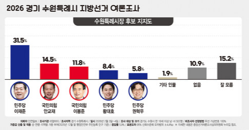 * 이번 조사는 인천일보 의뢰로 여론조사기관 ㈜리얼미터가 2026년 2월 3~4일 이틀간 수원시 거주 만 18세 이상 남녀 502명을 대상으로 무선 전화 가상번호를 이용한 자동 응답(ARS) 방식으로 진행됐다. 표본오차는 95% 신뢰수준에서 ±4.4%포인트다. 응답률은 5.9%다.