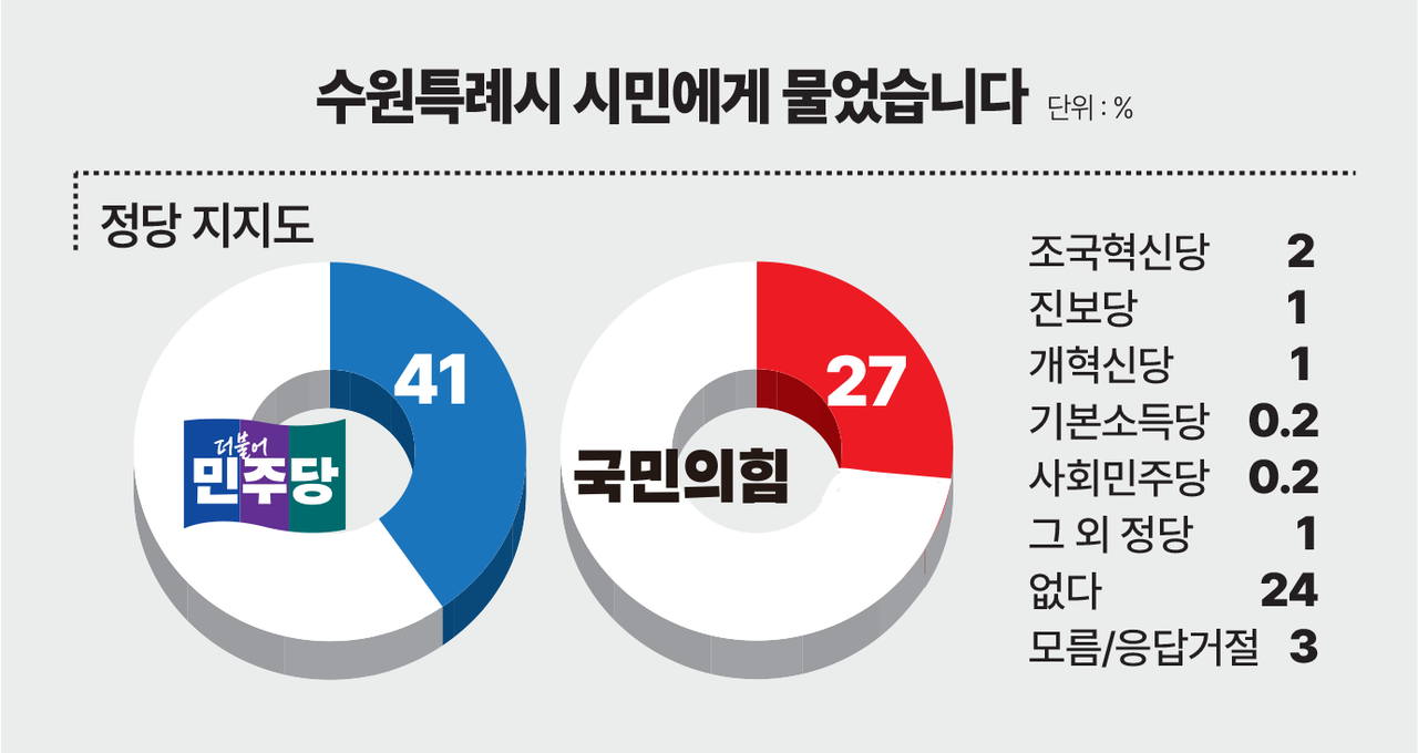 - 지역별로는 민주당이 장안구 54.3%, 영통구 46.3%, 팔달구 44.4%로 과반 안팎이었다. 권선구는 민주당 38.4%, 국힘 35.3%였다.