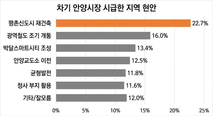 '평촌신도시 재건축' 22.7%, 안양교도소 이전 12.5%, 청사부지 활용 11.6%, 박달스마트시티 조성 13.4%, 광역철도 조기개통 16.0%, 원도심-신도시균형 11.8%, 지상전철 통합개발 4.8%