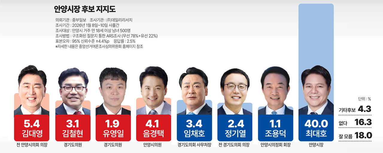 * 중부일보가 여론조사기관 데일리리서치에 의뢰해 실시한 이번 여론조사는 1월 8일부터 10일까지 사흘간 안양시에 거주하는 만 18세 이상 남녀 500명을 대상으로 구조화된 설문지를 이용해 유선 RDD와 통신사가 제공한 무선 가상번호 ARS 여론조사 방식(무작위추출)으로 진행됐다. 유·무선 비율은 유선 22%, 무선 78%다. 통계보정은 2025년 12월 말 행정안전부 주민등록 인구통계 기준 성별·연령별·지역별 가중값(셀가중)을 부여했다. 응답률은 2.5%, 표본오차는 95% 신뢰수준에 ±4.4%다. 기타 자세한 내용은 중앙선거여론조사심의위원회 홈페이지를 참고하면 된다.