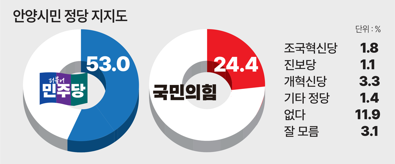 - 만안구와 동안구에서 더불어민주당을 지지한다고 밝힌 응답자의 비율은 각각 54.3%·52.1%였으며, 국민의힘은 26.3%·23.0%다.