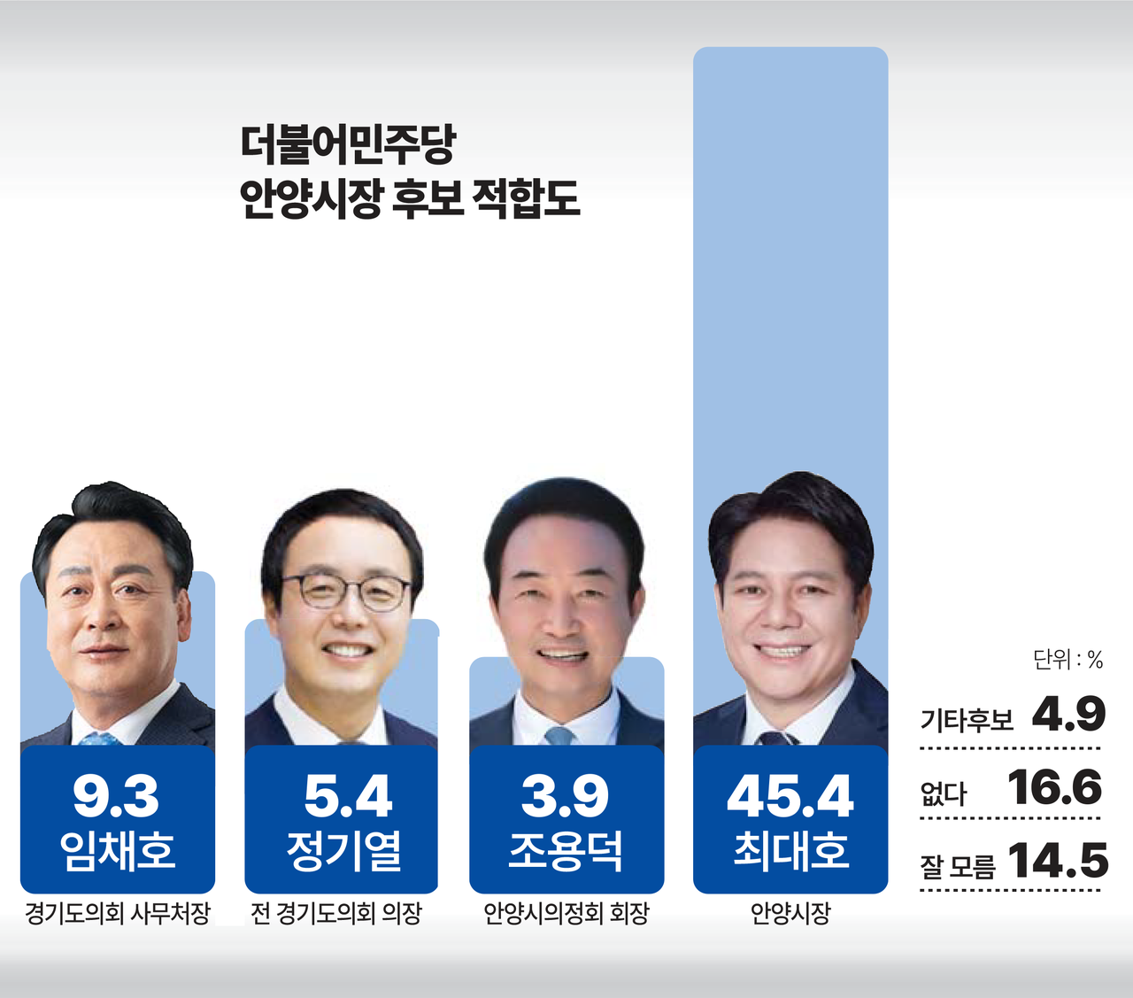 최대호 시장 45.4%, 임채호 경기도의회 사무처장 9.3%, 정기열 전 도의회 의장 5.4%, 조용덕 안양시의정회 회장 3.9%, 기타 인물 4.9%, 부동층(적합한 인물이 없다 16.6%·잘 모르겠다 14.5%) 31.1%