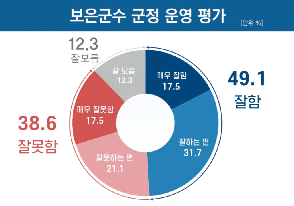 - 긍정 평가가 과반에는 미치지 못했으나 절반에 근접한 수치를 보인 반면, 40%에 가까운 부정 평가층이 존재한다는 점에서 현직 군수에 대한 지지와 불만이 공존하는 여론 지형이 있는 것으로 풀이된다.