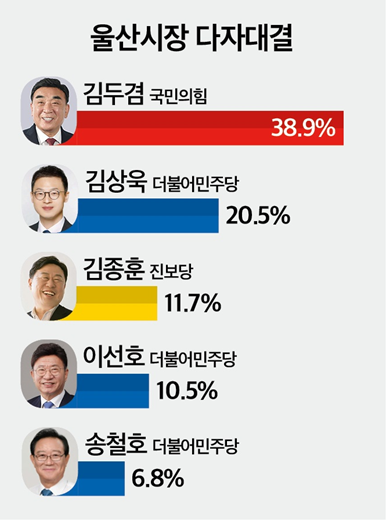 국민의힘 김두겸 시장 38.9%, 민주당 김상욱 의원 20.5%, 진보당 김종훈 현 울산 동구청장 11.7%, 민주당 이선호 현 청와대(대통령실) 자치발전비서관 10.5%, 민주당 송철호 전 울산시장 6.8%, '그 외 다른 인물' 2.2%, '지지할 후보가 없다' 7.2%, '잘 모르겠다' 2.1%