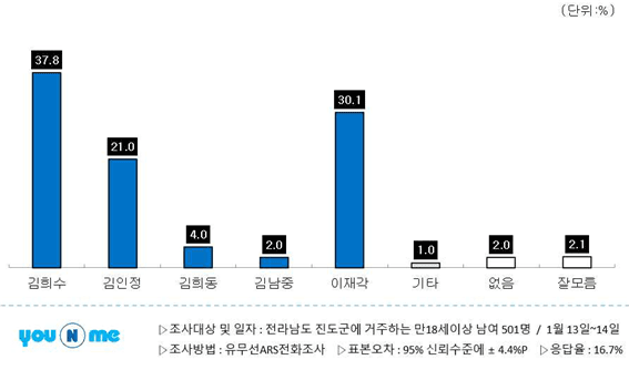 - 가선거구(진도읍·군내면·고군면·의신면) (조사완료 360명 / 가중값 적용 342명) 김희수 37.8%, 이재각 32.3%, 김인정 19.4%, 김희동 3.5%, 김남중 2.0%, 잘모름 1.9%, 없음 1.7%, 기타 1.5%