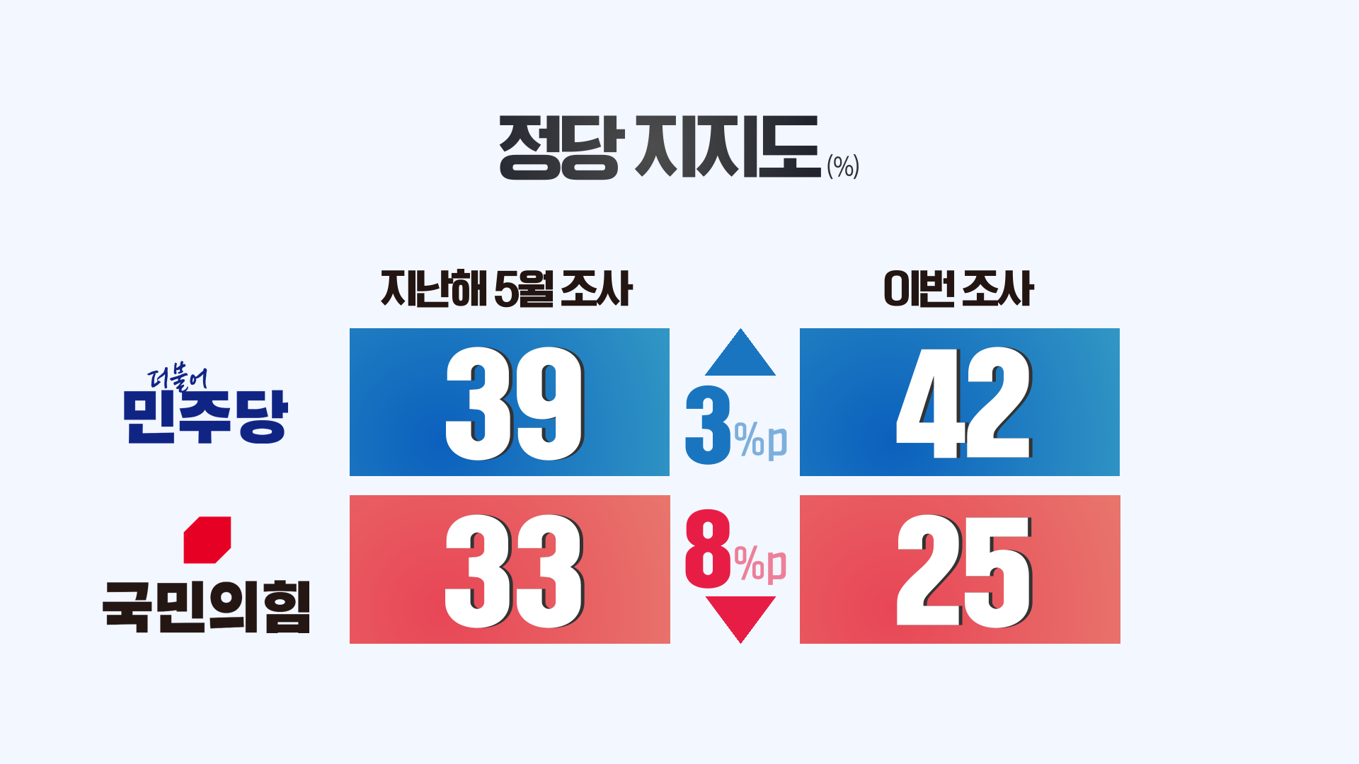 - 지난해 5월, 대선을 앞두고 KBS청주가 실시한 조사와 비교해 민주당은 3%P 상승했고 국민의힘은 8%P 하락해 격차가 더 벌어졌습니다.