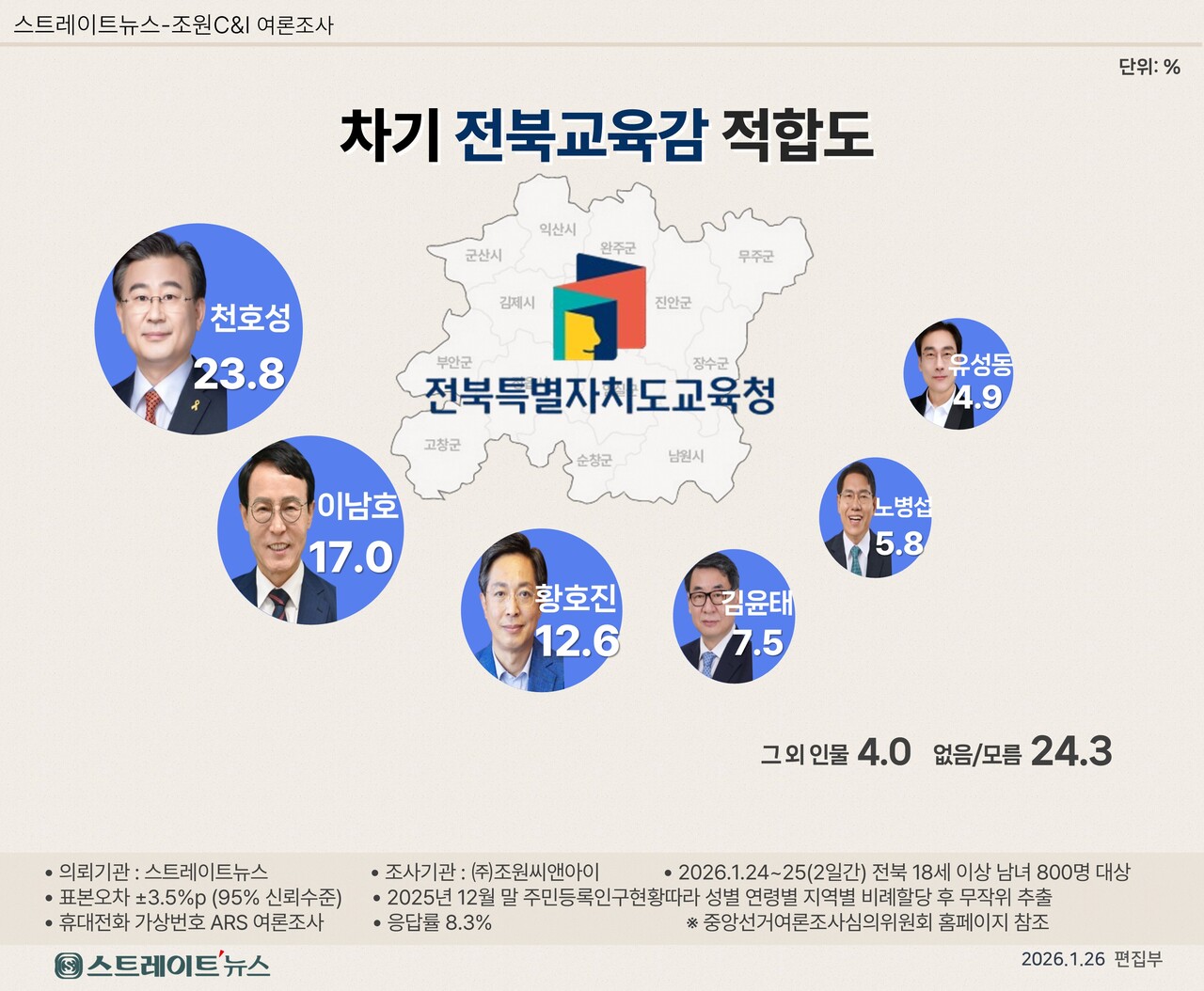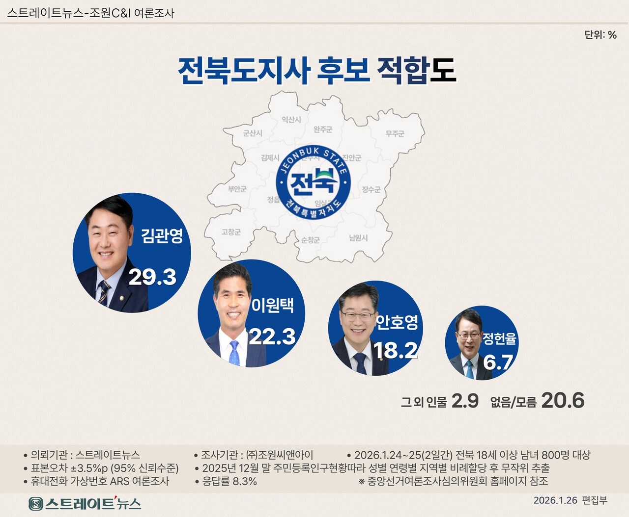 * 이번 조사는 스트레이트뉴스 의뢰로 조원씨앤아이가 2026년 1월 24~25일 2일간 전라북도 거주 18세 이상 남녀 대상으로 ARS 여론조사(휴대전화 가상번호 100%, 성, 연령대, 지역별 비례할당 무작위 추출)를 실시한 결과다. 표본수는 800명(총 통화시도 9691명, 응답률 8.3%), 표본오차는 95% 신뢰수준에 ±4.4%p다. 자세한 사항은 중앙선거여론조사심의위원회 홈페이지를 참조하면 된다.