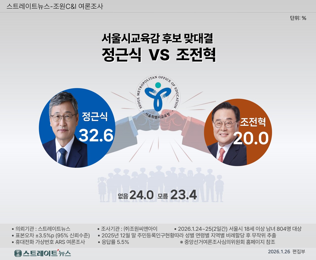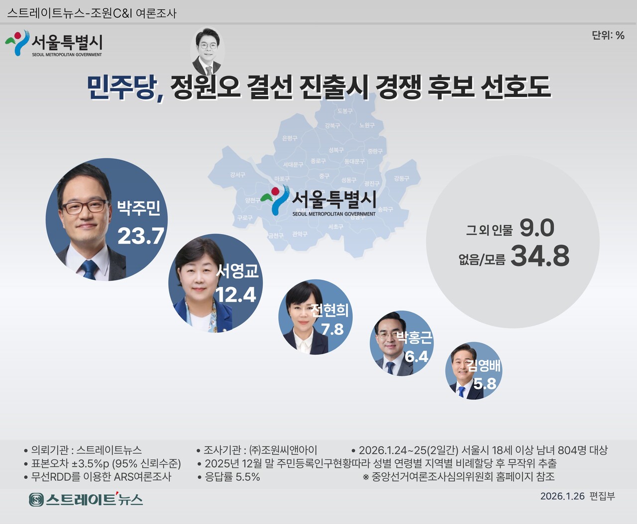 * 이번 조사는 스트레이트뉴스 의뢰로 조원씨앤아이가 2026년 1월 24~25일 2일간 서울시 거주 18세 이상 남녀 대상으로 ARS 여론조사(휴대전화 가상번호 100%, 성, 연령대, 지역별 비례할당 무작위 추출)를 실시한 결과다. 표본수는 804명(총 통화시도 14,634명, 응답률 5.5%), 표본오차는 95% 신뢰수준에 ±3.5%p다. 그 밖의 사항은 중앙선거여론조사심의위원회 홈페이지를 참조하면 된다.