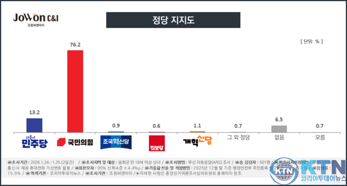 * 이번 조사는 코리아투데이뉴스 의뢰로 조원씨앤아이가 2026년 1월 24~25일 이틀간 경상북도 봉화군 거주 만 18세 이상 남녀를 대상으로 무선 자동응답(ARS) 여론조사(휴대전화 가상번호 100%, 성, 연령대, 지역별 비례할당 무작위 추출)를 실시한 결과이며 표본수는 501명, 표본오차 95% 신뢰수준에 ±4.4%포인트, 응답률은 15.9%임. 그 밖의 사항은 중앙선거여론조사심의위원회 홈페이지 참조 ※가중치 부여 방식: 성별, 연령대별, 지역별 가중값 부여(2025년 12월 말 행정안전부 발표 주민등록인구 기준)