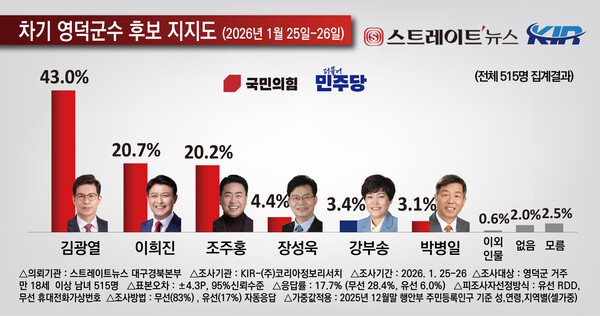 * 이번 조사는 스트레이트뉴스대구경북본부, 대경타임즈 공동의뢰로 여론조사 전문기관 코리아정보리서치에서 2026년 1월 25~26일 이틀간 영덕군 거주 만 18세 이상 남녀 515명을 대상으로 무선 ARS(83%), 유선 ARS(17%) 방식으로 진행됐다.