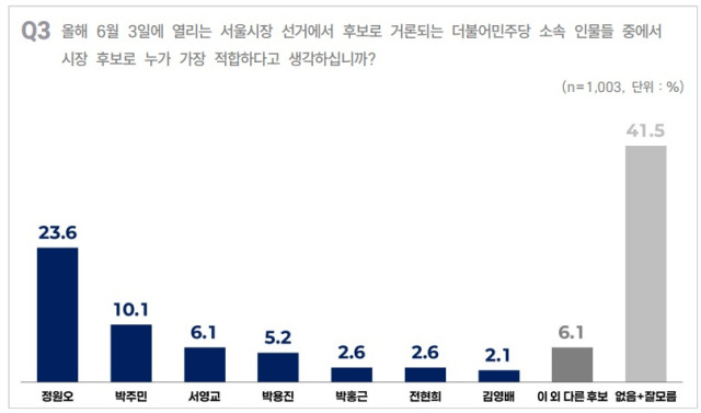 정원오 성동구청장 23.6%, 박주민 의원 10.1%, 서영교 의원 6.1%, 박용진 전 의원 5.2%, 박홍근 의원, 전현희 의원 각 2.6%, 김영배 의원 2.1%, '이 외 다른 후보' 6.1%, '적합한 후보가 없다' 31.6%, '잘 모르겠다' 9.9%