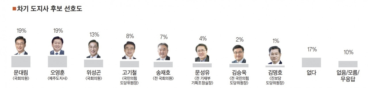 오영훈 지사 19%, 문대림 국회의원 19%, 위성곤 국회의원 13%, 고기철 국민의힘 제주도당위원장 8%, 송재호 전 민주당 국회의원 7%, 문성유 전 기획재정부 기획조정실장(국민의힘) 4%, 김승욱 전 제주도당위원장(국민의힘) 2%, 김명호 진보당 제주도당위원장 1%, 적합한 후보가 없다 17%, 결정못했다·모름·무응답 10%