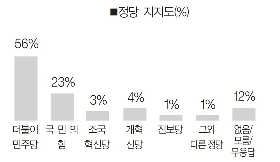 더불어민주당 56%, 국민의힘 23%, 개혁신당 4%, 조국혁신당 3%, 진보당 1%, ‘없음·모름·무응답’ 12%