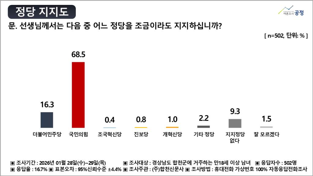 -합천신문 조사 여론조사공정 주식회사 실시 2026년 1월 28~29일 합천군 거주 만 18세 이상 남녀 502명 대상 무선 ARS 100% 표본오차 95% 신뢰수준 ±4.4%p 응답률 16.7%