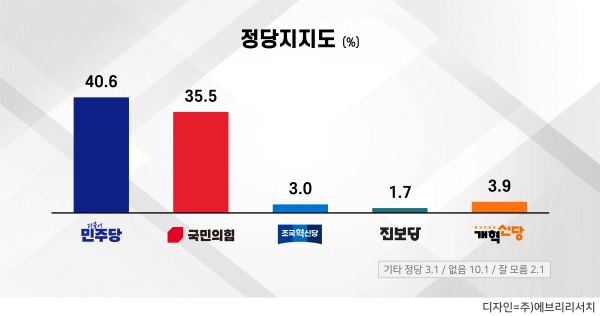더불어민주당 40.6%, 국민의힘 35.5%, 개혁신당 3.9%, 조국혁신당 3.0%, 진보당 1.7%, 기타 정당 3.1%, 지지 후보 없음 10.1%, 잘 모르겠다 2.1%