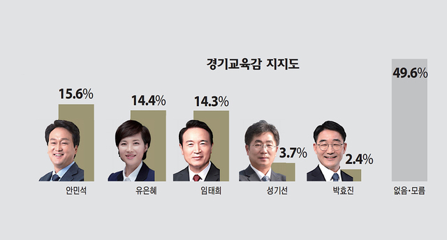 안민석 전 국회의원 15.6%, 유은혜 전 교육부 장관 14.4%, 임태희 현 경기도교육감 14.3%, 성기선 전 한국교육과정평가원장 3.7%, 박효진 현 경기교육연대 상임대표 2.4%, ‘없음·모름’ 49.6%