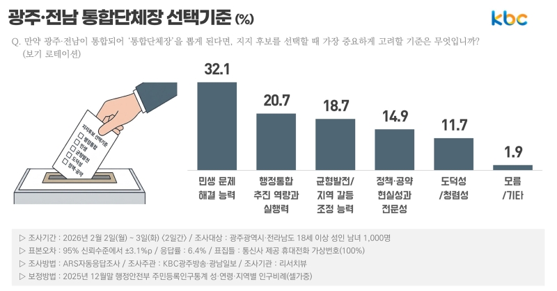 ‘지역경제·일자리 등 민생 문제 해결 능력’ 32.1%, ‘행정통합을 안정적으로 추진할 수 있는 역량과 실행력’ 20.7%, ‘광주·전남 균형발전과 지역 갈등 조정 능력’ 18.7%, ‘정책·공약의 현실성과 전문성’ 14.9%, ‘도덕성·청렴성 등 인물 신뢰도’ 11.7%