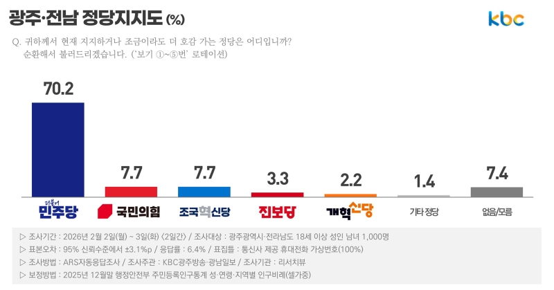 광남일보와 KBC광주방송 공동 의뢰, 리서치뷰 2월 2~3일 광주·전남 만 18세 이상 시·도민 1000명 대상 조사