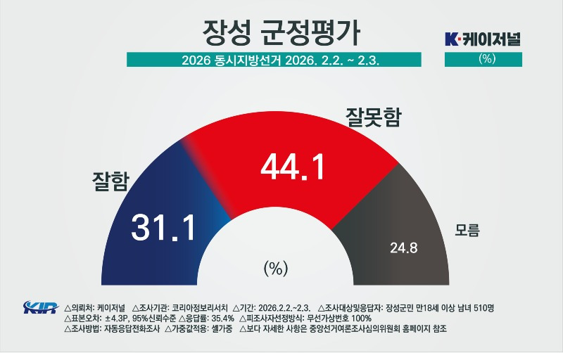 * 이번 조사는 케이저널 의뢰로 코리아정보리서치에서 2월 2일부터 3일까지 이틀간 장성군에 거주하는 만 18세 이상 남녀 510명을 대상으로, 무선전화 가상번호(100%)를 이용하여 자동응답 방식으로 진행됐다. 응답률은 35.4%이고, 표본오차는 95%의 신뢰수준에 ±4.3%p다. 통계보정은 2025년 12월 말 행정안전부 발표 주민등록 인구 기준 성, 연령, 지역별 셀가중값을 부여했다. 보다 자세한 내용은 중앙선거여론조사심의위원회 홈페이지를 참고하면 된다.