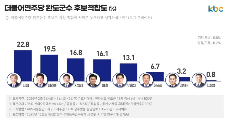 김신 현 더불어민주당 정책위 부의장 22.8%, 신의준 현 전남도의원 19.5%, 지영배 전 행정자치부 서기관 16.8%, 이철 현 전남도의회 부의장 16.1%, 우홍섭 전 진도군 부군수 13.1%, 허궁희 현 완도군의원 6.7%, 김세국 전 전남도청 감사관 3.2%, 김재현 현 김대중재단 완도군지회장 0.8%, 기타후보 0.8%, 없다/모른다 0.2%