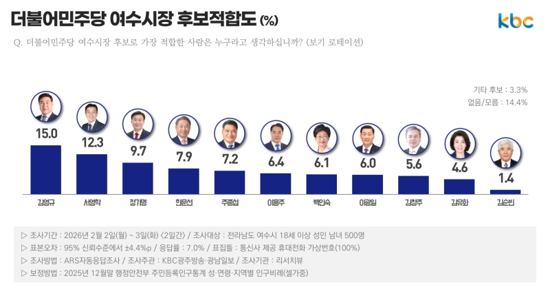 KBC광주방송 의뢰, 리서치뷰 2월 2~3일 여수시 거주 만 18세 이상 유권자 500명 대상 조사