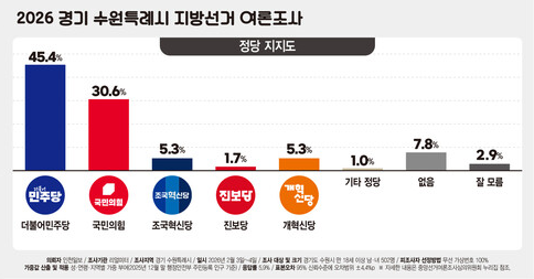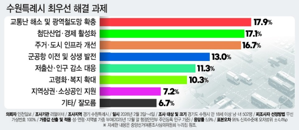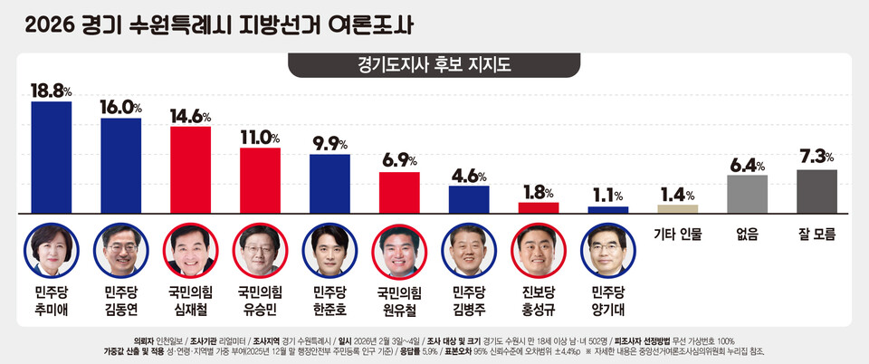 * 이번 조사는 인천일보 의뢰로 여론조사기관 ㈜리얼미터가 2026년 2월 3~4일 이틀간 수원시 거주 만 18세 이상 남녀 502명을 대상으로 무선 전화 가상번호를 이용한 자동 응답(ARS) 방식으로 진행됐다. 표본오차는 95% 신뢰수준에서 ±4.4%포인트다. 응답률은 5.9%다.