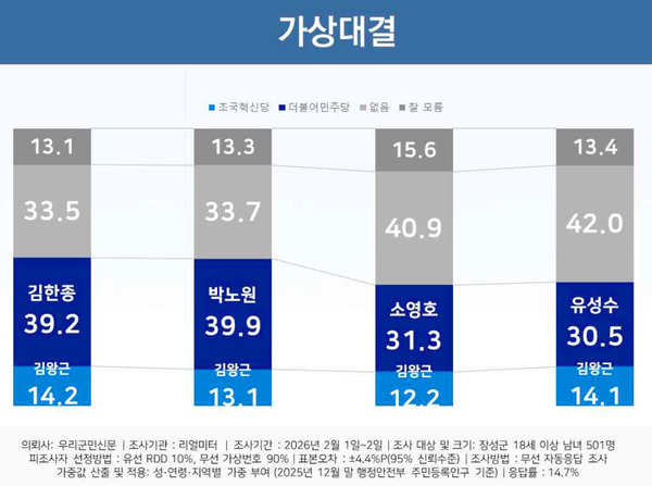 우리군민신문 의뢰, 리얼미터 2월1일~2일 장성군 거주 만 18세 이상 남녀 501명 대상 조사