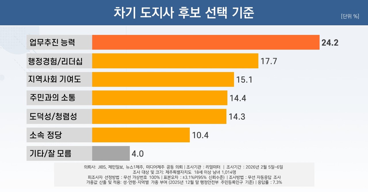 ‘업무 추진 능력’ 24.2%, ‘행정 경험·리더십’ 17.7%, ‘지역사회 기여도’ 15.1%, ‘주민과의 소통’ 14.4%, ‘도덕성·청렴성’ 14.3%, ‘소속 정당’ 10.4%