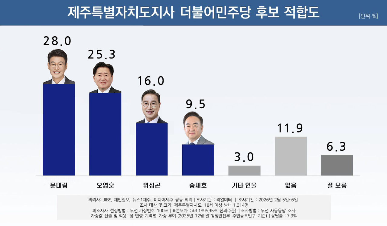 문대림 의원 28.0%, 오영훈 지사 25.3%, 위성곤 국회의원 16.0%, 송재호 전 국회의원 9.5%, 기타 인물 3.0%, ‘없음’ 11.9%, ‘잘 모름’ 6.3%