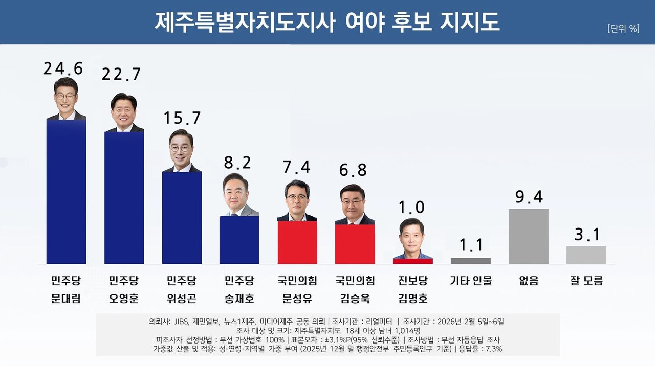 제민일보, JIBS, 뉴스1제주, 미디어제주 등 제주지역 언론4사 공동, 리얼미터 2월 5일-6일 제주특별자치도 만 18세 이상 남녀 1014명 대상 조사