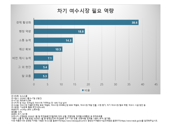 경제 활성화 38.6%, 행정역량 18.8%, 소통 능력 14.3%, 예산확보 능력 10.5%, 비전 제시 7.1%