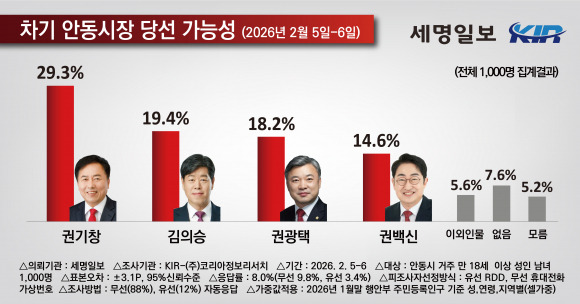 * 세명일보 의뢰로 코리아정보리서치에서 지난 5~6일, 경북 안동 거주 18세 이상 남녀 1,000명을 대상으로, 무선전화 가상번호(88%)와 유선전화 RDD(12%)를 이용해 자동응답 방식으로 여론조사를 진행했다. 응답률은 전체 8.0%며, 무선전화 9.8%, 유선전화 3.4%고, 표본오차는 95% 신뢰수준에 ±3.1%p다. 통계보정은 2026년 1월 말 행정안전부 발표 주민등록 인구 기준 성, 연령, 지역별 셀가중값을 부여했다. 보다 자세한 내용은 중앙선거여론조사심의위원회 홈페이지(https://www.nesdc.go.kr)를 참고하면 된다.