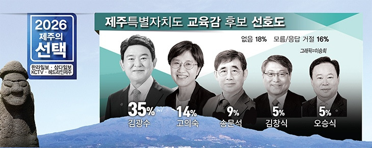 김광수 현 교육감 35%, 고의숙 제주도의회 교육의원 14%, 송문석 전 서귀중앙여중 교장 9%, 김창식 교육의원 5%, 오승식 교육의원 5%, '없다' 18%, '모름·응답거절' 16%