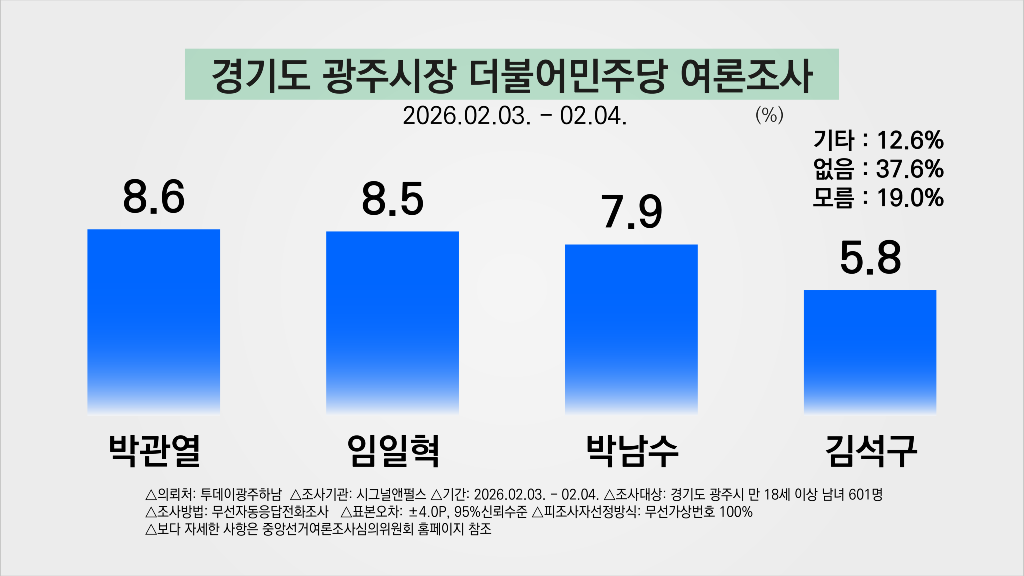 * 이는 투데이광주하남이 시그널앤펄스에 의뢰하여 2026년 02월 03일부터 02월 04일까지 이틀간 경기도 광주시민 601명을 대상으로 무선자동응답전화조사로 진행됐다. 보다 자세한 사항은 중앙선거여론조사심의위원회 홈페이지를 참조하면 된다.